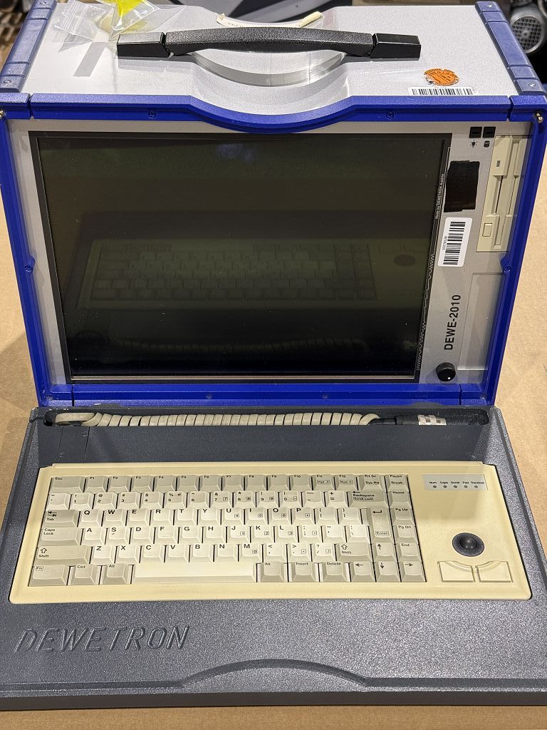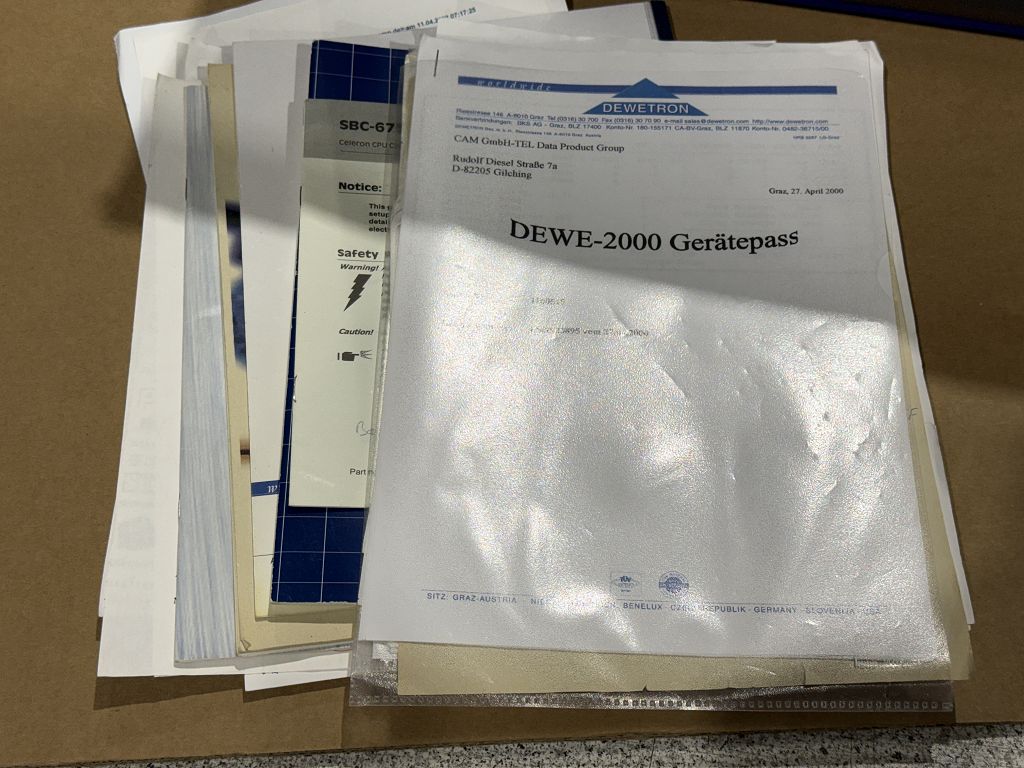 Das Gerät ist eindeutig über die Modellbezeichnung DEWE-2010 identifizierbar. Laut beiliegender Dokumentation (DEWE-2000 Gerätepass) stammt das System aus einer Lieferung vom 27.04.2000.