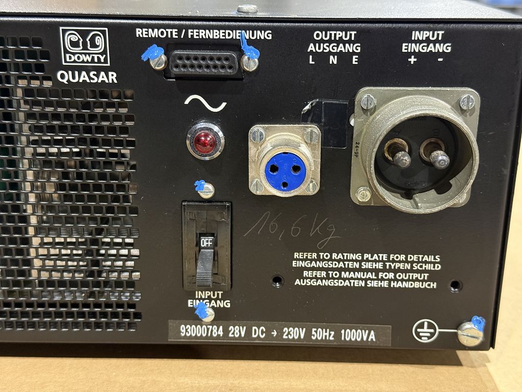 Der industrielle Dowty Quasar 1000 Stromwandler ist ein DC-AC Power Converter des Herstellers Dowty zur Umwandlung von Gleichspannung in Wechselspannung. Das Gerät arbeitet mit 24 V DC Eingangsspannung und liefert 230 V AC bei 50 Hz mit einer Leistung von 1000 VA.