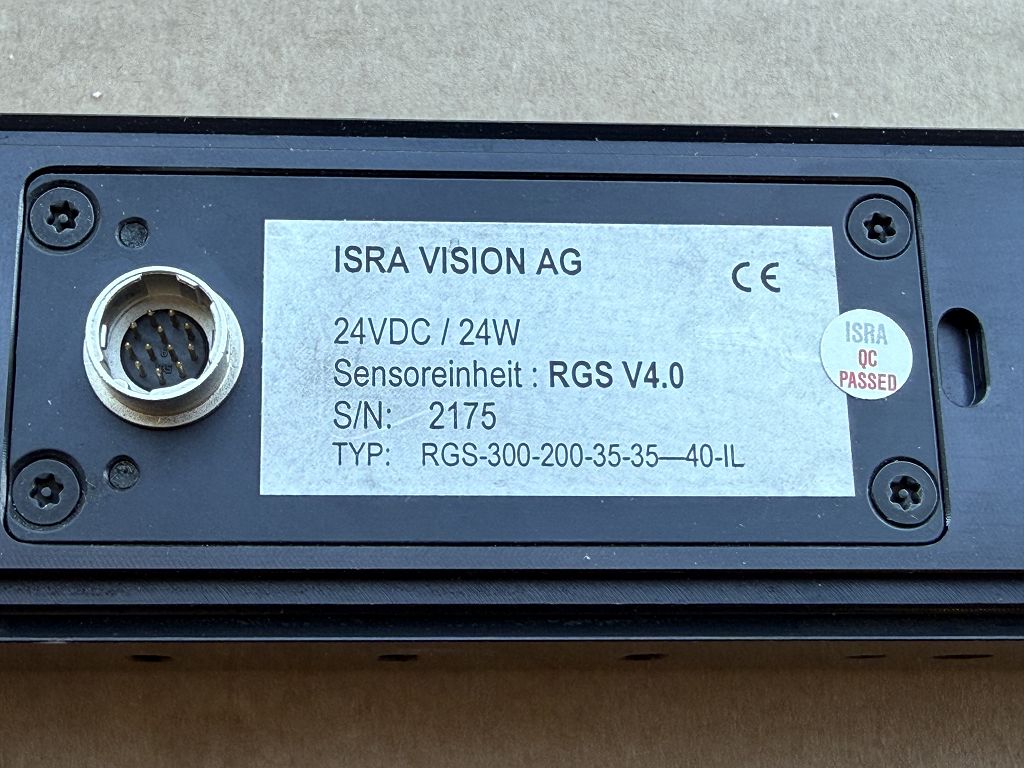 Die ISRA VISION RGS V4.0 Sensoreinheit ist ein industrielles Vision-System für optische Inspektionsanwendungen. Das Gerät mit der Typbezeichnung RGS-300-200-35-35-m40-ILN-M19 und der Artikelnummer AX:164055 ist eindeutig identifizierbar über die Seriennummer 2175. Auf dem Typenschild sind zudem 24VDC / 24W sowie die Version RGS V4.0 angegeben. Typischer Einsatz erfolgt in industriellen Bildverarbeitungs- und Inspektionssystemen.