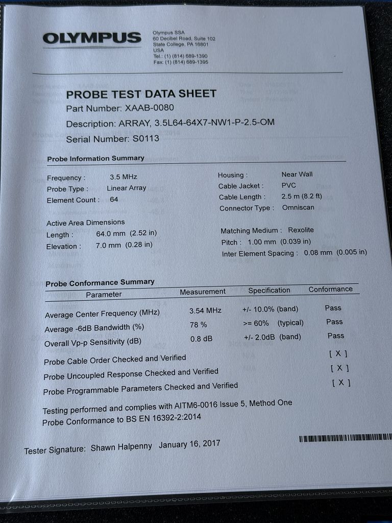 Olympus Phased Array Prüfkopf / Ultraschallsonde für industrielle zerstörungsfreie Prüfungen. Es handelt sich um das Modell 3.5L64-64X7-NW1-P-2.5-OM mit der Artikelnummer XAAB-0080 und Seriennummer S0113. Der Prüfkopf ist für den Einsatz mit OmniScan-Systemen ausgelegt und eignet sich für industrielle Prüf- und Wartungsanwendungen. Die Identifikation erfolgt eindeutig über die vorhandenen Typenschilder und das zugehörige Datenblatt.