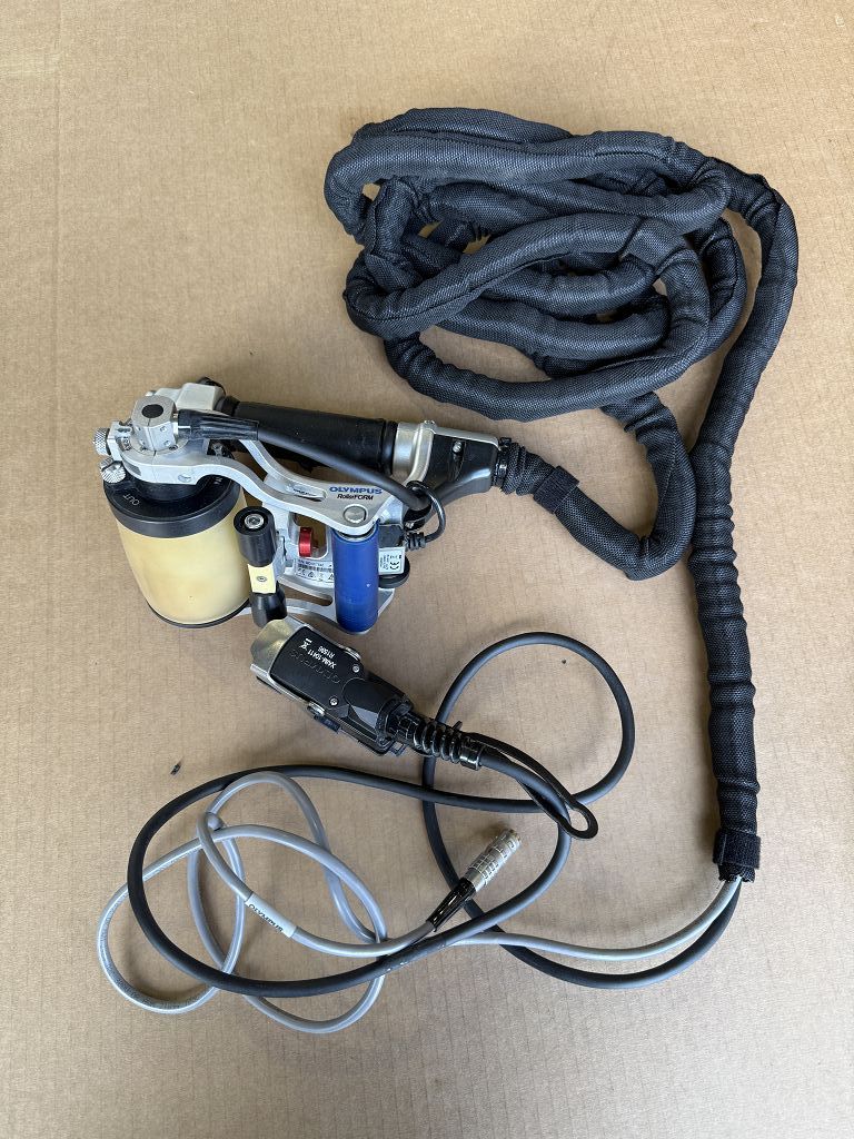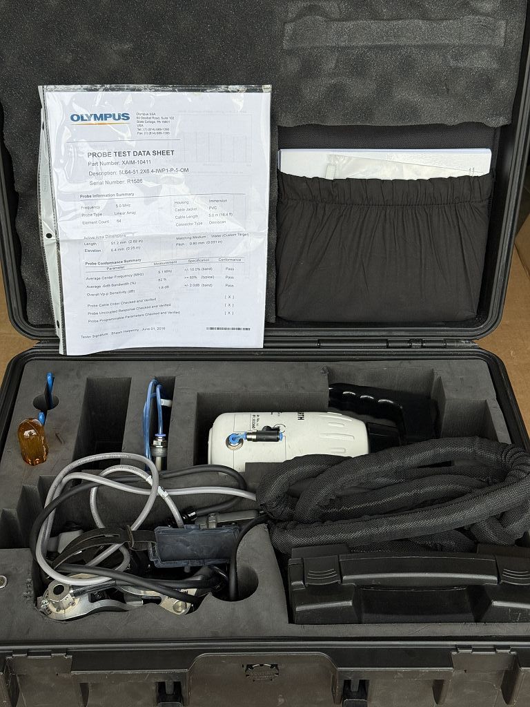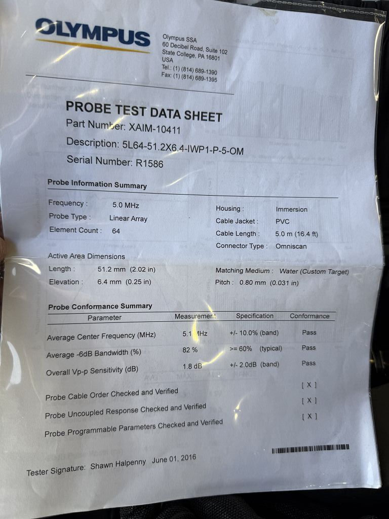 Der Olympus RollerFORM Scanner ist ein industrieller Phased-Array-Sensor als Breitstrahlroller für die zerstörungsfreie Werkstoffprüfung. Das System umfasst den RollerFORM Scanner sowie eine zugehörige Sonde mit der Kennzeichnung XAIM-10411 und der Bezeichnung ROLLERFORM-5L64-5M. Typischer Einsatz erfolgt in der industriellen Prüfung und Qualitätssicherung.