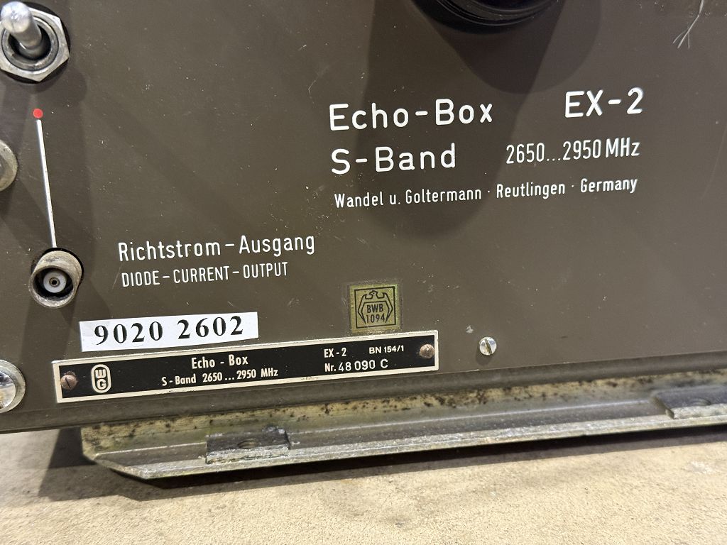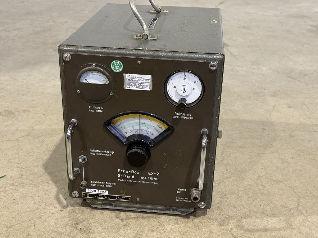Diese Echo-Box EX-2 von Wandel & Goltermann ist ein spezialisiertes S-Band Messgerät für Frequenzbereiche von 2650 bis 2950 MHz. Das Gerät stammt aus Bundeswehr Bestand und verfügt über mehrere analoge Anzeigen zur Messung von Richtstrom sowie Ausgangsdämpfung. Die eindeutige Identifikation erfolgt über die Gerätebezeichnung EX-2 sowie die aufgebrachte Artikelnummer 9020 2602.