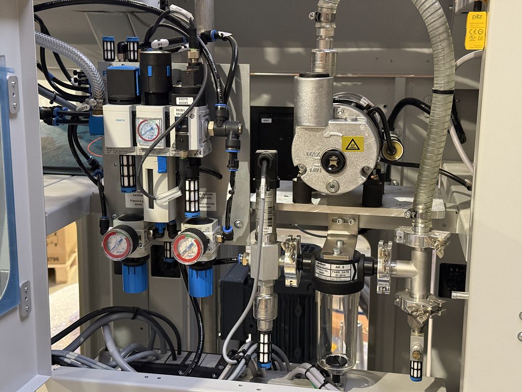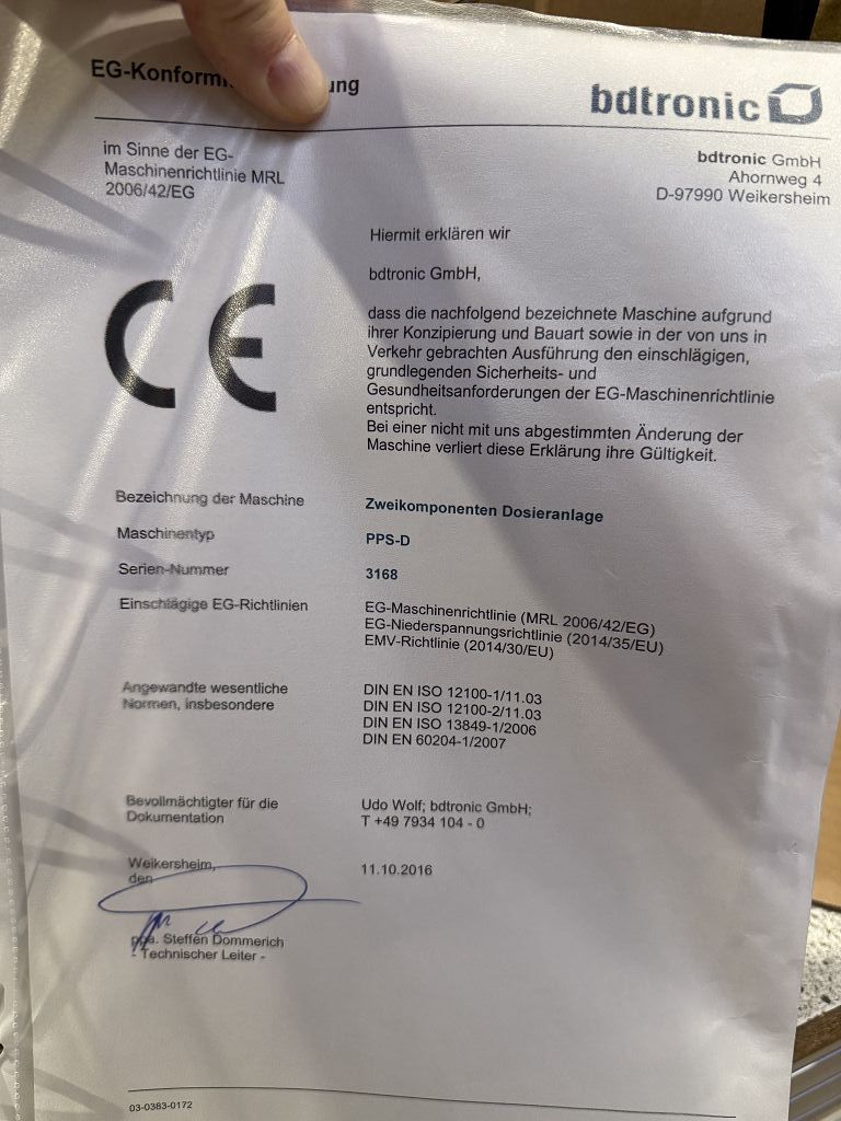 Diese industrielle Zweikomponenten Dosieranlage von bdtronic ist eine präzise und robuste Lösung für automatisierte Dosierprozesse. Es handelt sich um den Typ PPS-D mit der Seriennummer 3168 und Baujahr 05/2016. Die Anlage stammt aus dem Einsatz bei Audi AG in Ingolstadt und verfügt über zwei Materialstationen (A/B), integrierte Vakuumtechnik sowie umfangreiche Steuerungs- und Pneumatikkomponenten. Sie ist für industrielle Misch- und Dosierprozesse ausgelegt.