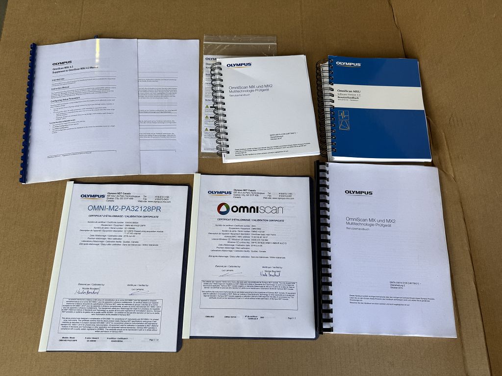 - Scope of delivery: OmniScan MX2 unit, OMNI-M2-PA32128PR module, transport case, power supply, cables, USB dongles (OMNIPC-A, TomoView TV210-F incl. Analysis), manuals and documentation as shown