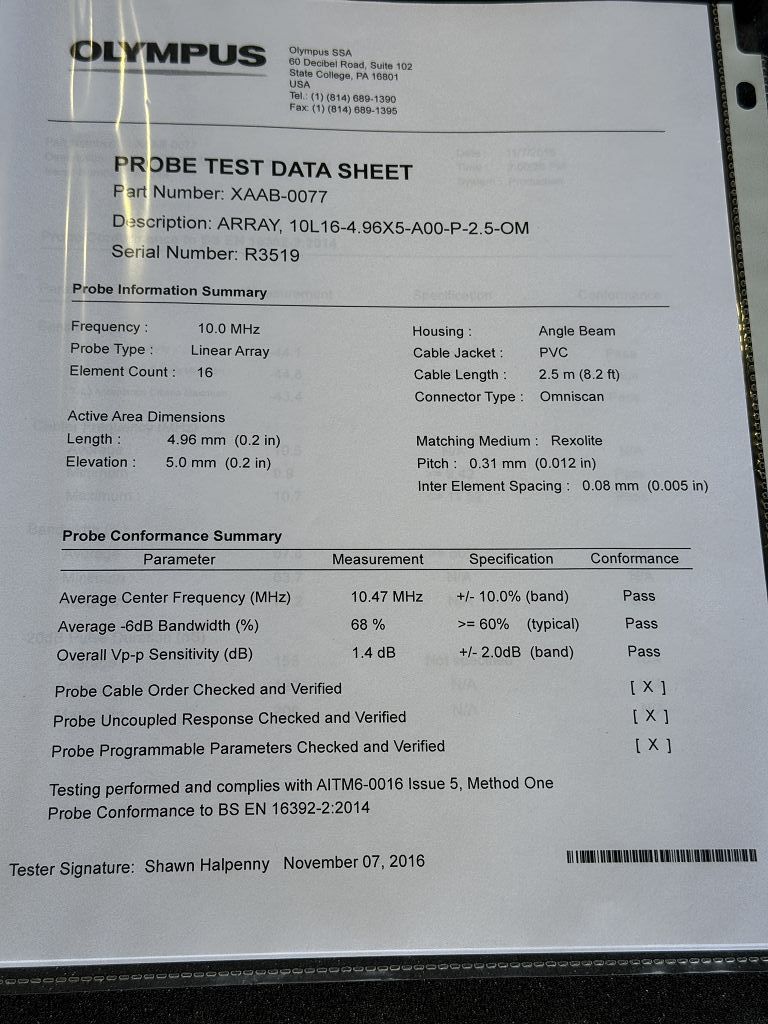 Olympus phased array ultrasonic probe designed for industrial non-destructive testing applications. This unit is model 10L16-4.96X5-A00-P-2.5-OM with part number XAAB-0077 and serial number R3519. It is compatible with OmniScan systems and typically used in inspection and maintenance environments. Identification is clearly based on labeling and included probe test data sheet.
