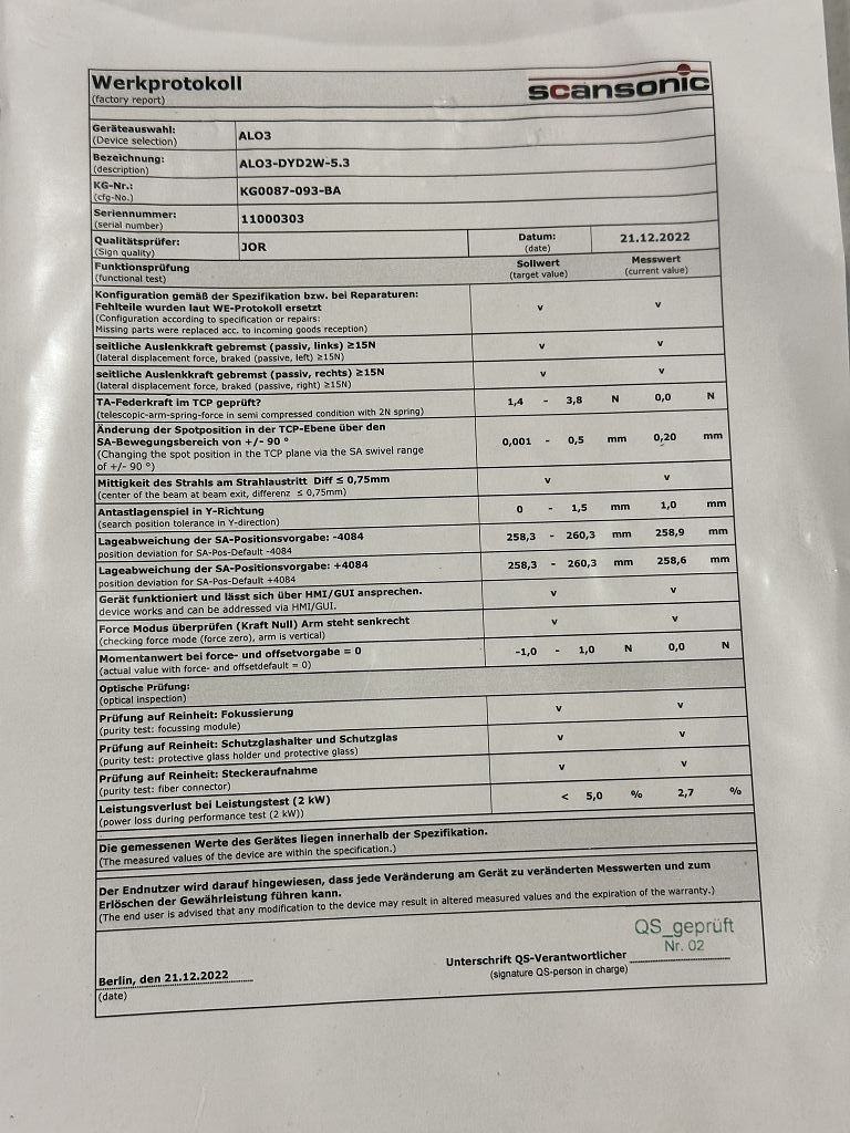 High-precision laser head from Scansonic for industrial laser processing. The ALO3-DYD2W-5.3 system (part number KG0087-093-BB) was in use at Audi until the end of 2022, tested with inspection report dated 21.12.2022, and stored since. Ideal for precision welding, cutting, and laser applications.
